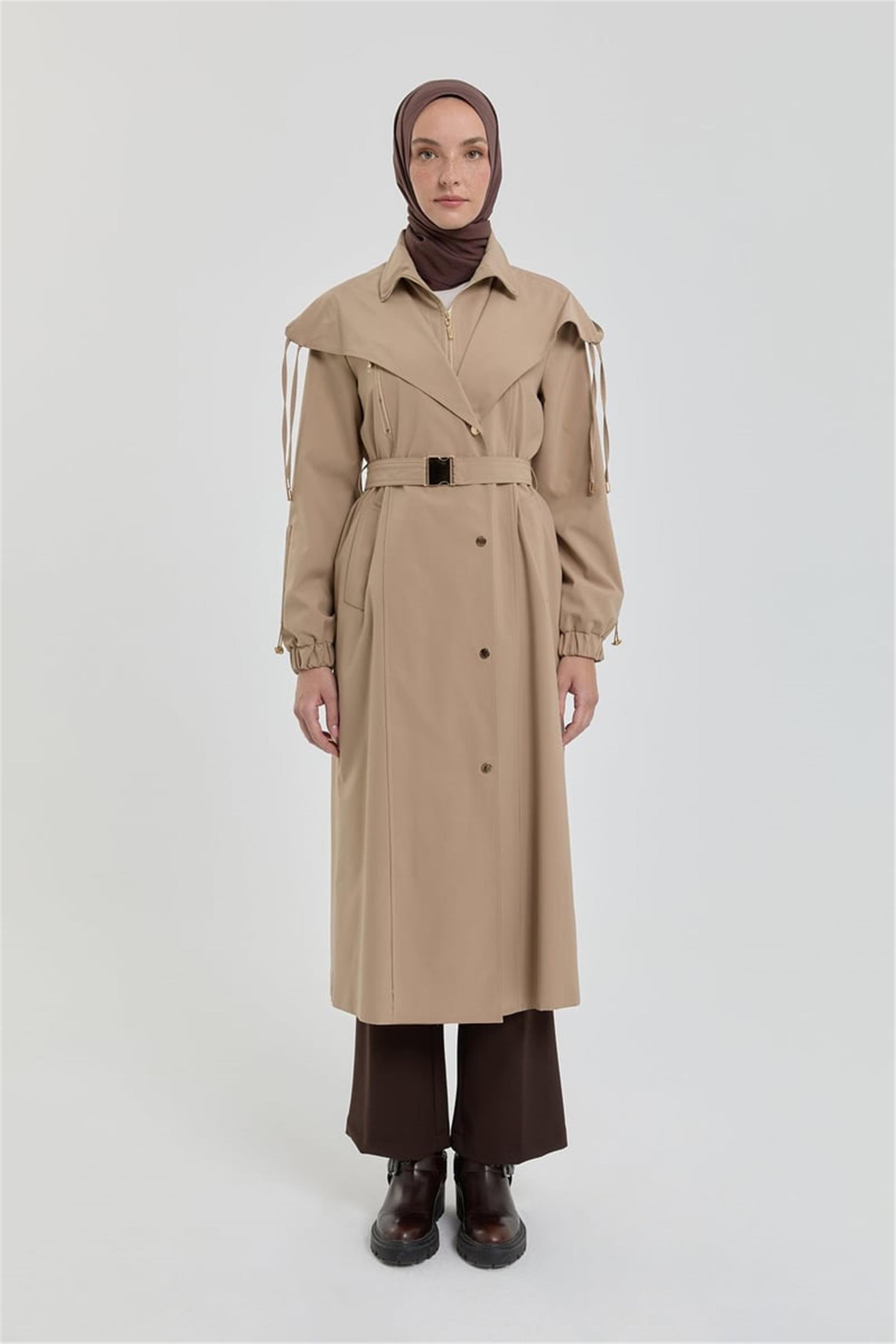 Aksesuar Detaylı Kuşaklı Kap Bej