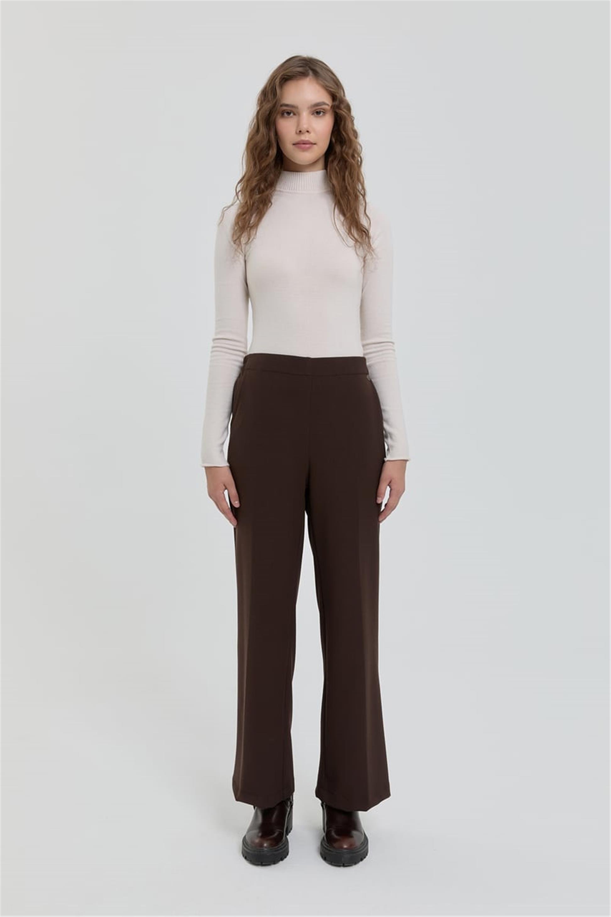 Arka Beli Lastikli Ütü İzli Boru Paça Pantolon Kahve