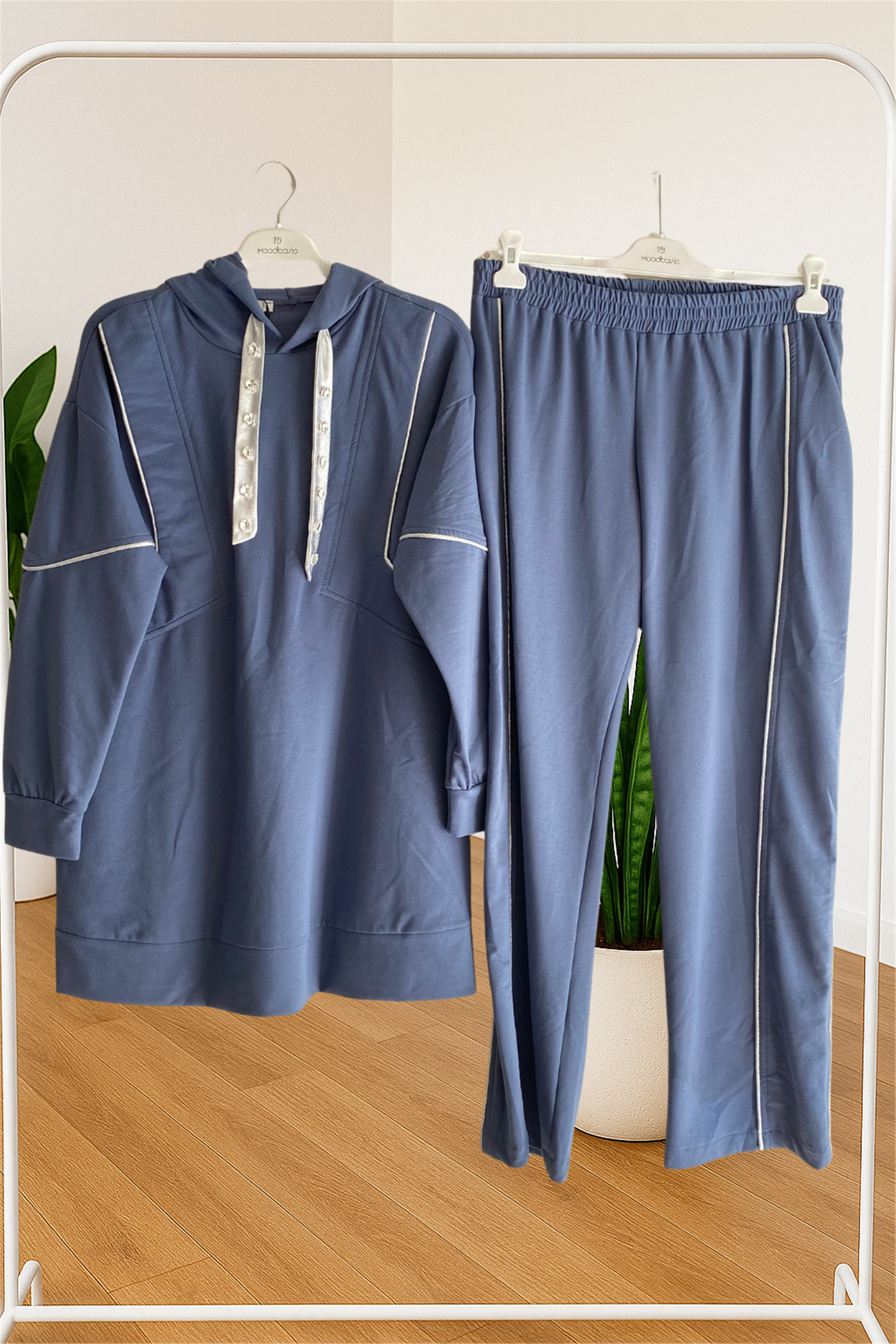 Bağcığı Taşlı Kapüşonlu Takım İndigo - 25KMB24693
