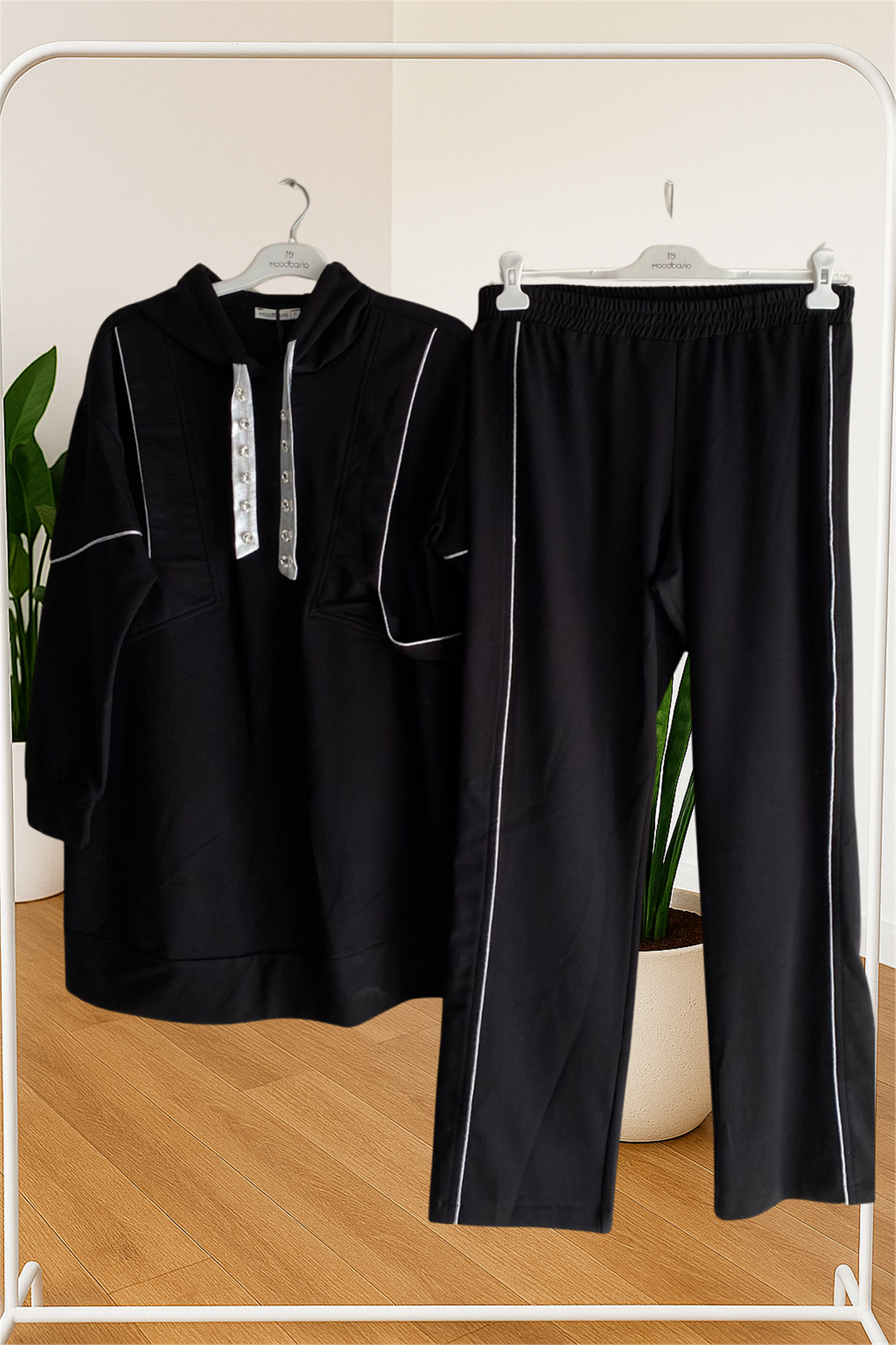 Bağcığı Taşlı Kapüşonlu Takım Siyah - 25KMB24693