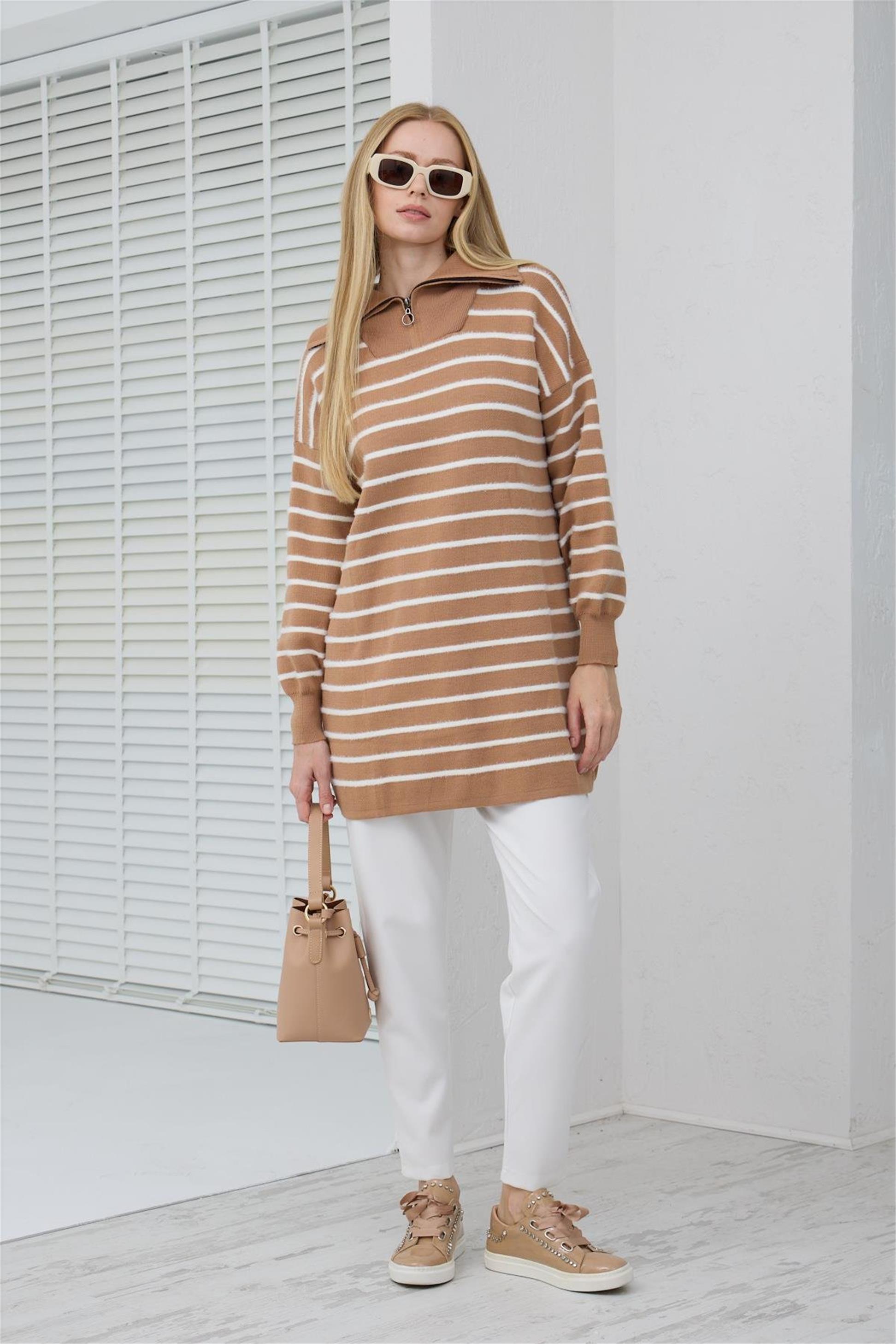 Balıkçı Yaka Çizgili Triko Kazak Camel - 25KMB3033