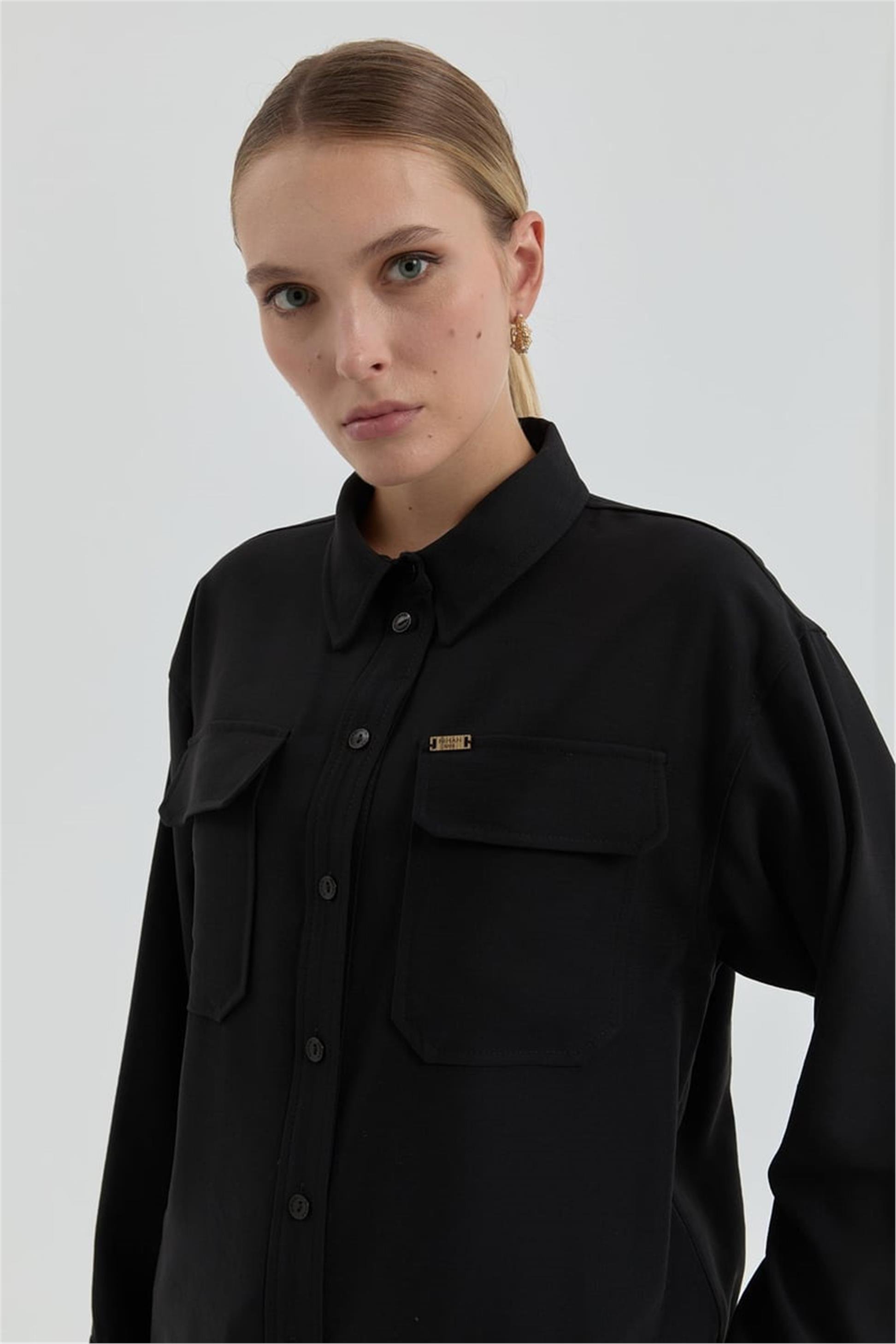 Cep Detaylı Gömlek Yaka Modal Tunik Siyah