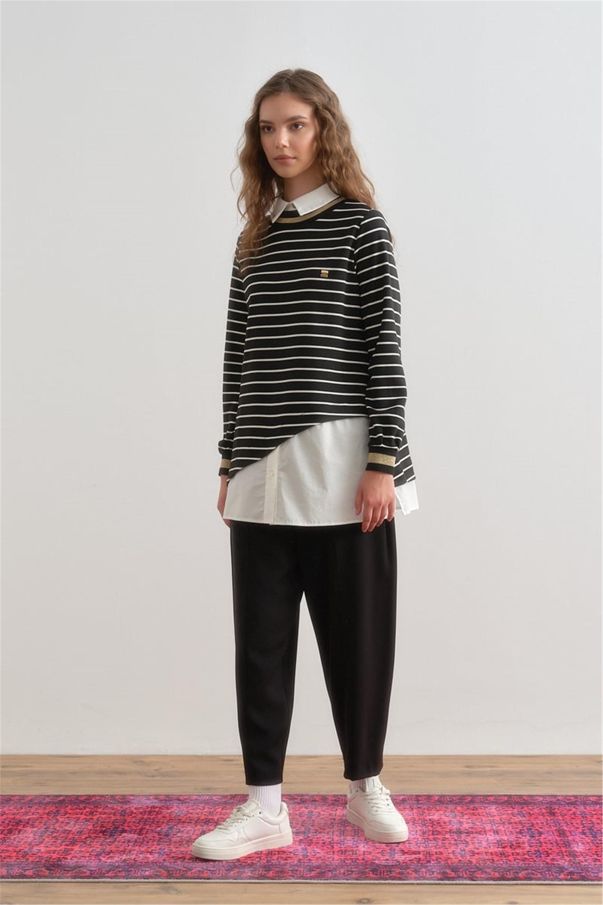 Çizgili Gömlek Yaka Örme Çelik Tunik Siyah