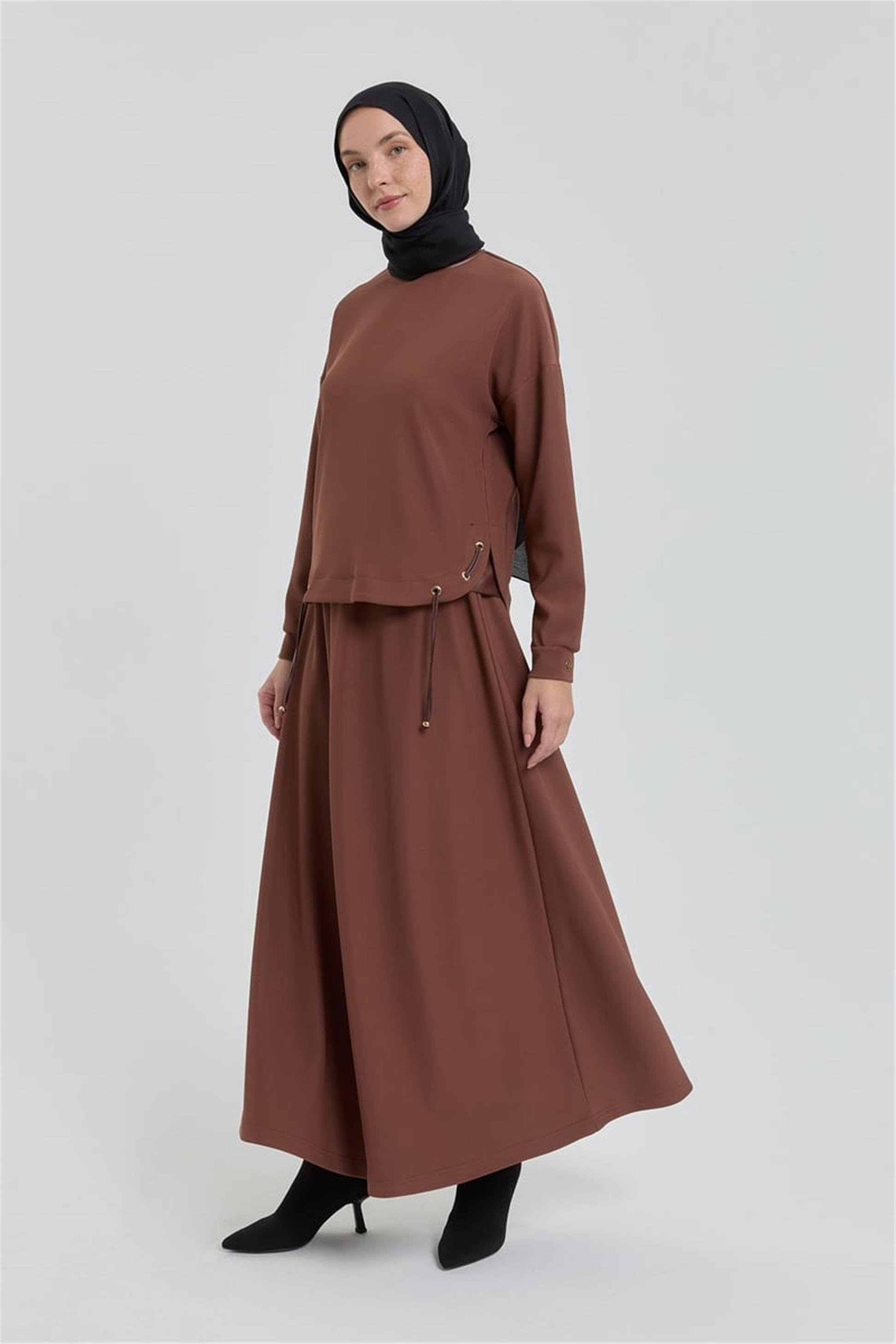 Deri Detaylı Örme Etek Bluz Takım Kahve