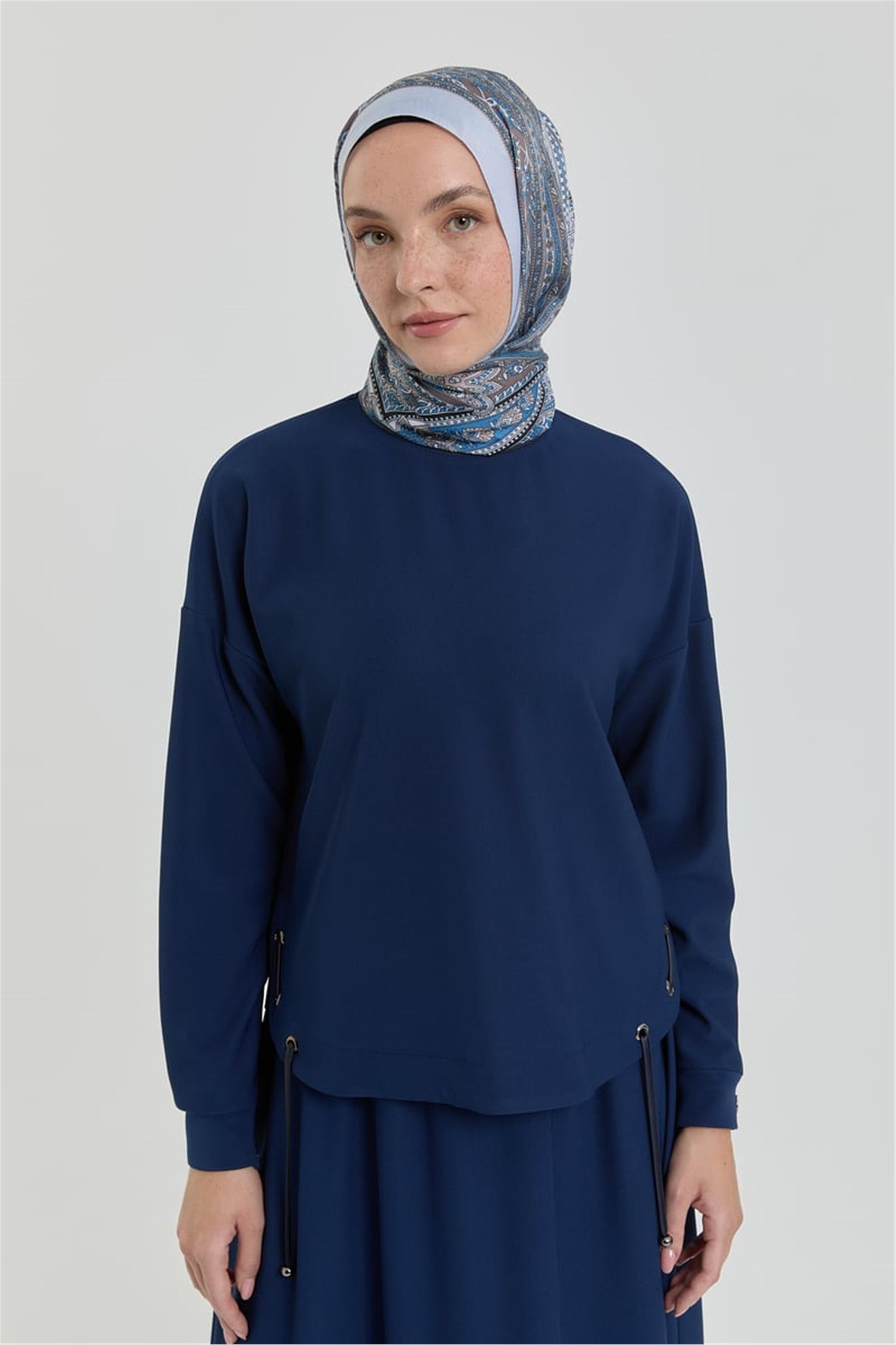 Deri Detaylı Örme Etek Bluz Takım Lacivert