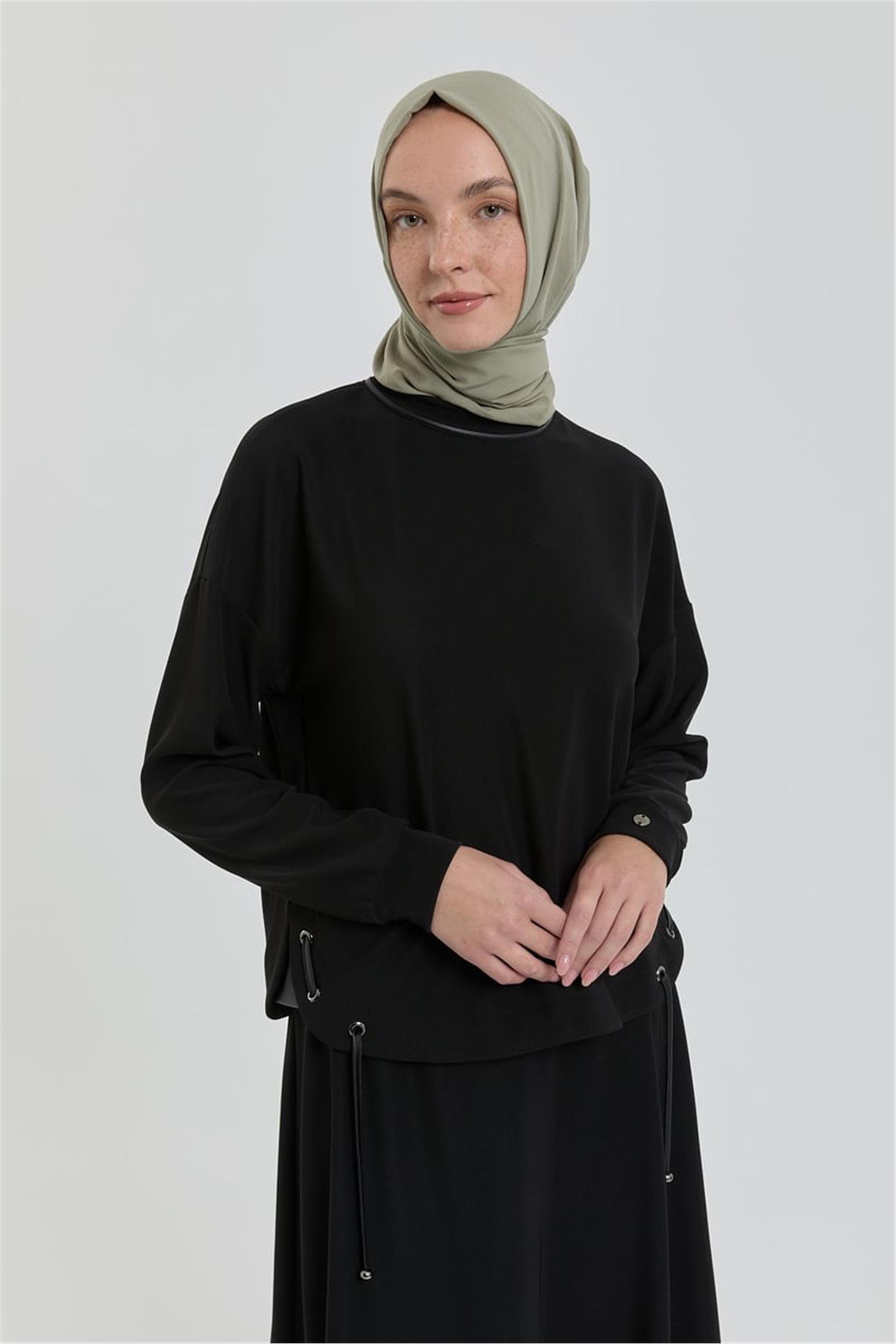 Deri Detaylı Örme Etek Bluz Takım Siyah