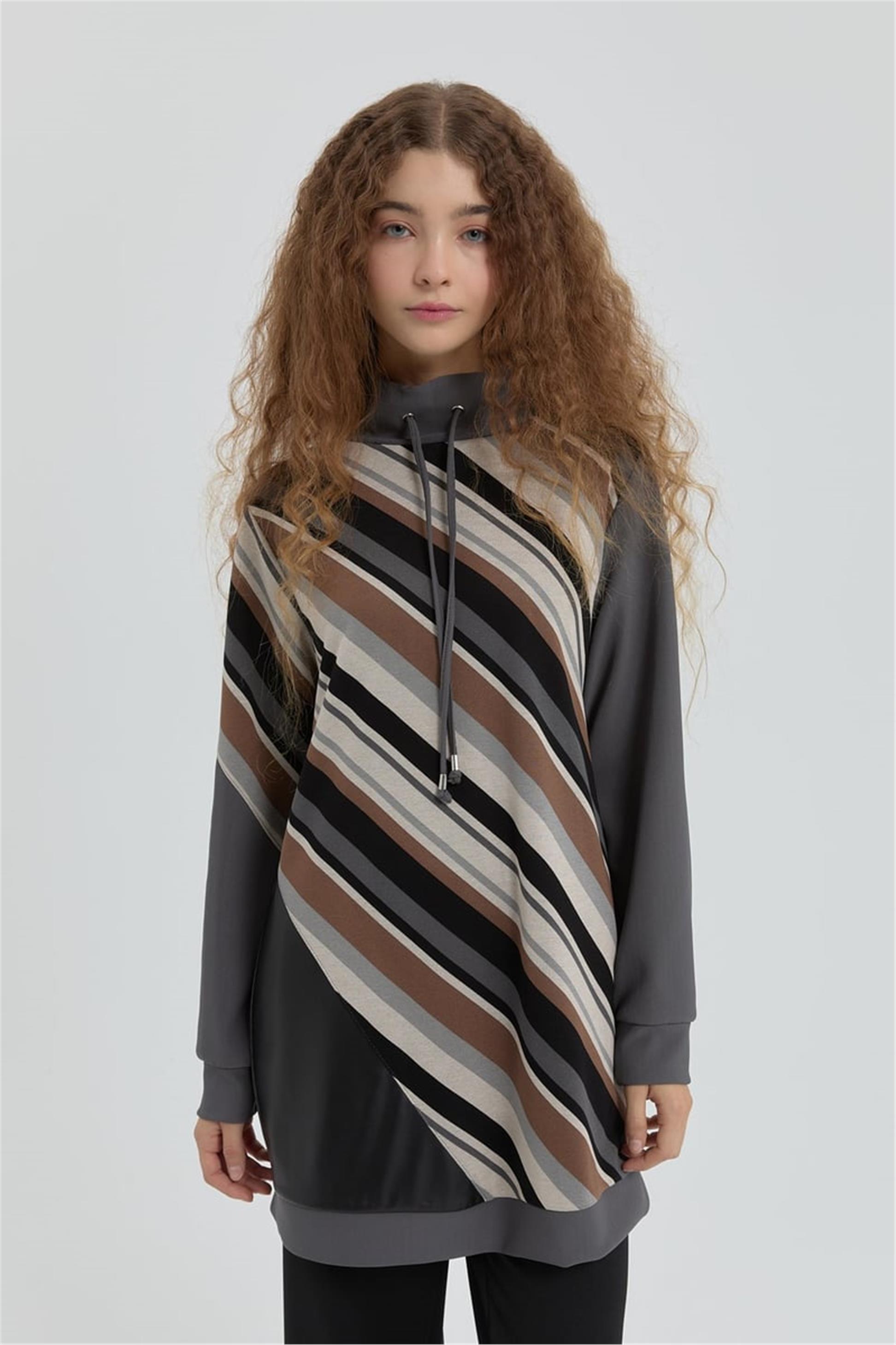 Dik Yaka Desenli Tunik Sweatshırt Füme