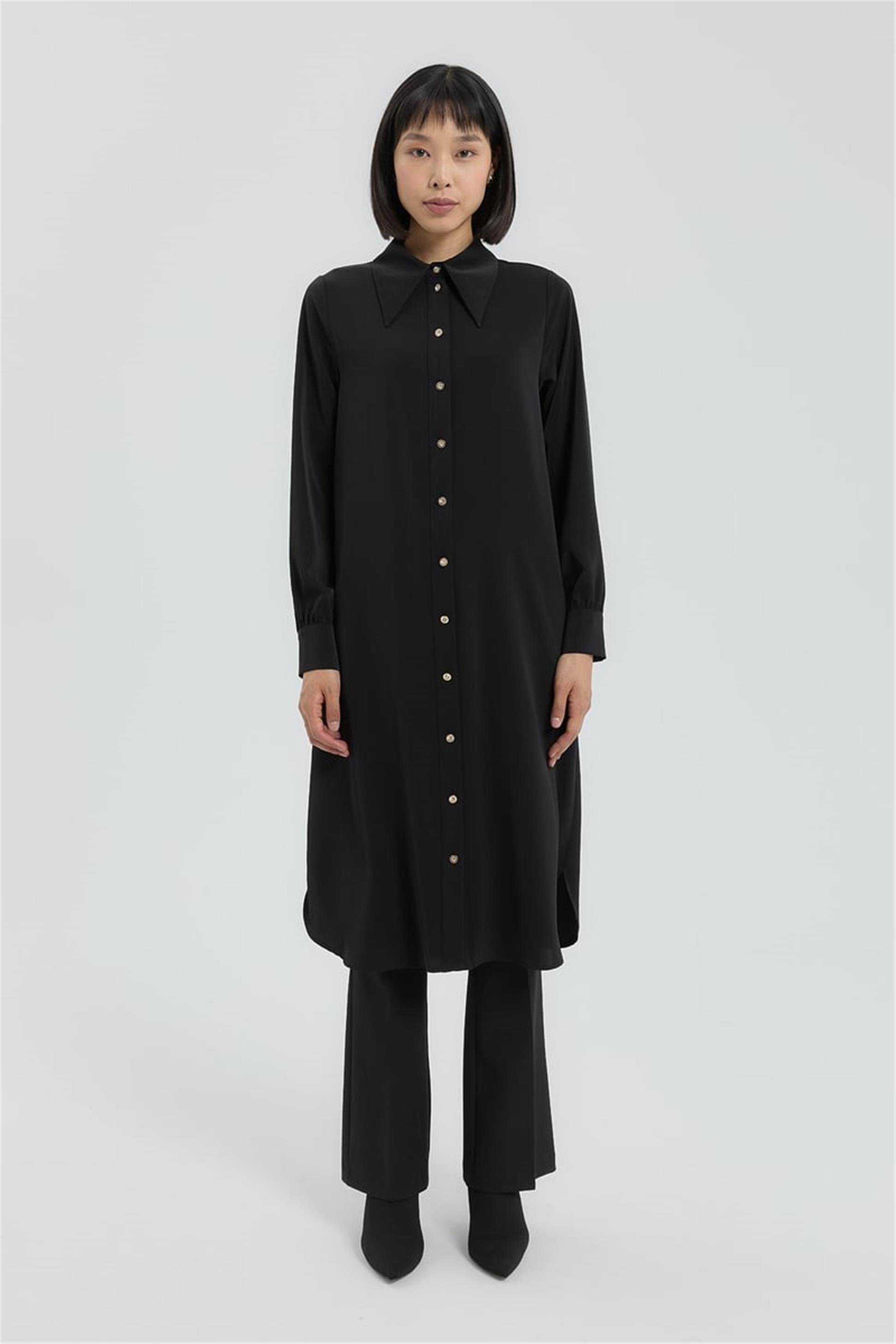 Gold Düğmeli Gömlek Yaka Tunik Siyah
