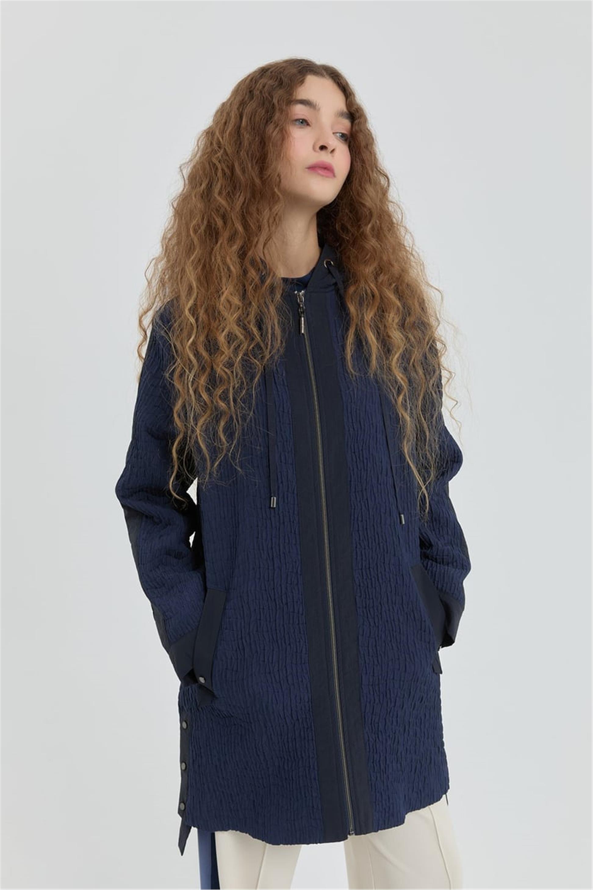 İnce Kapitone Kapşonlu Kap Lacivert