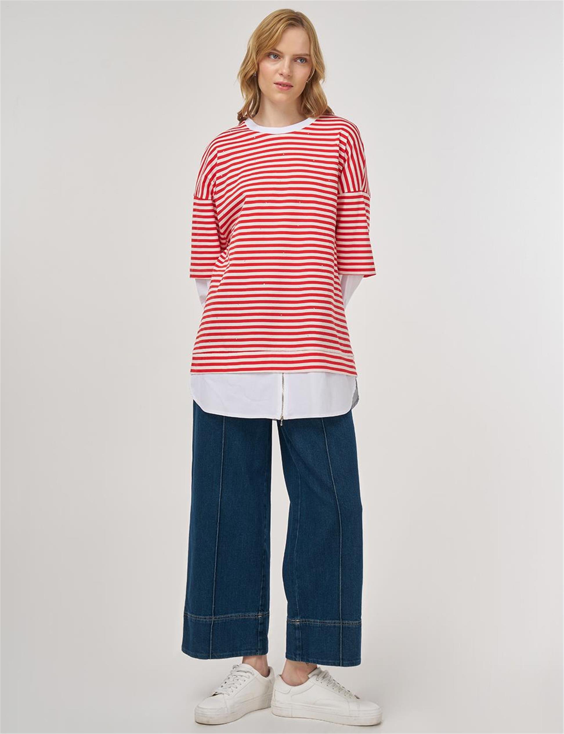 %100 Pamuklu Gömlek Detaylı Sweatshirt Kırmızı
