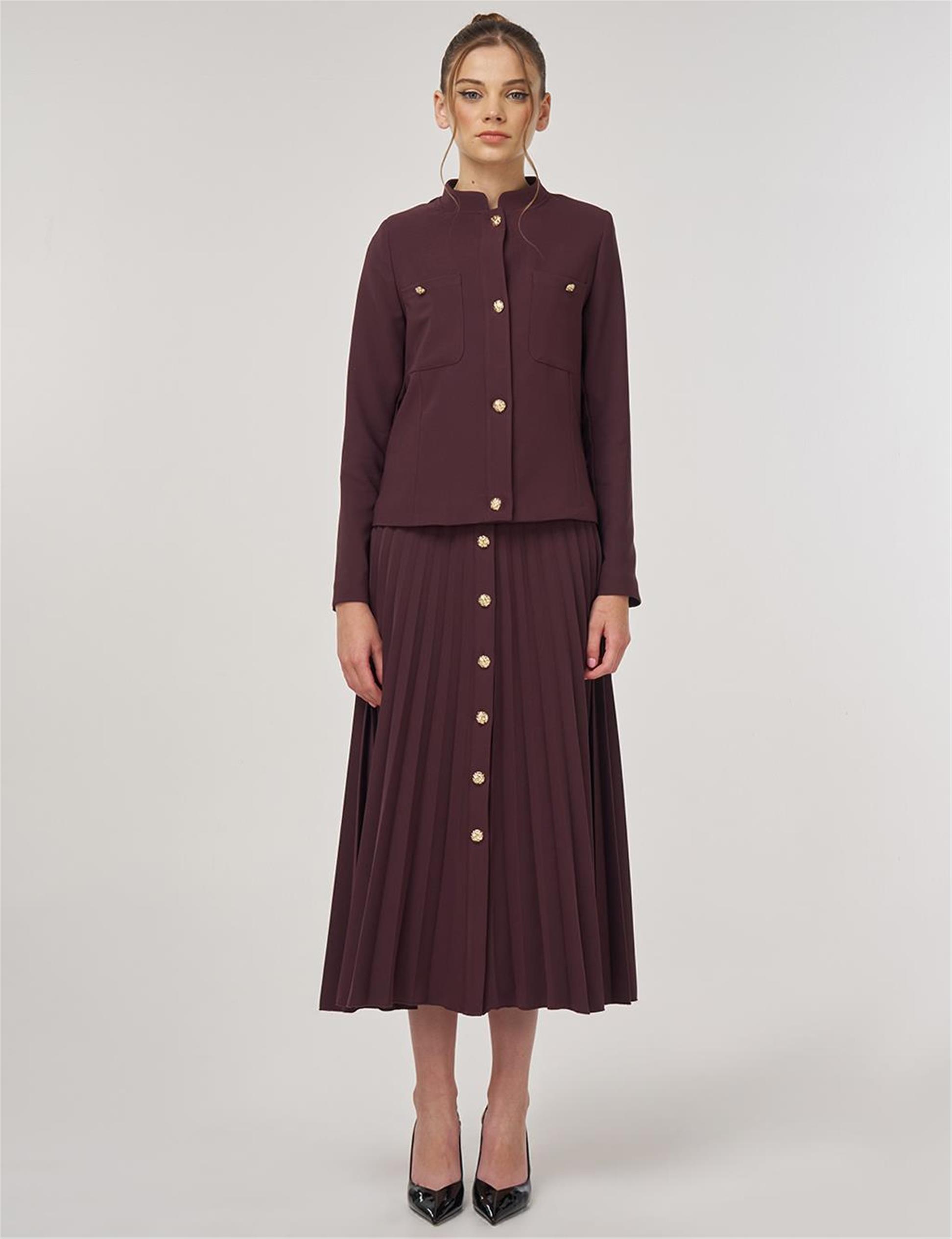 Gold Düğmeli Etekli Takım Koyu Bordo