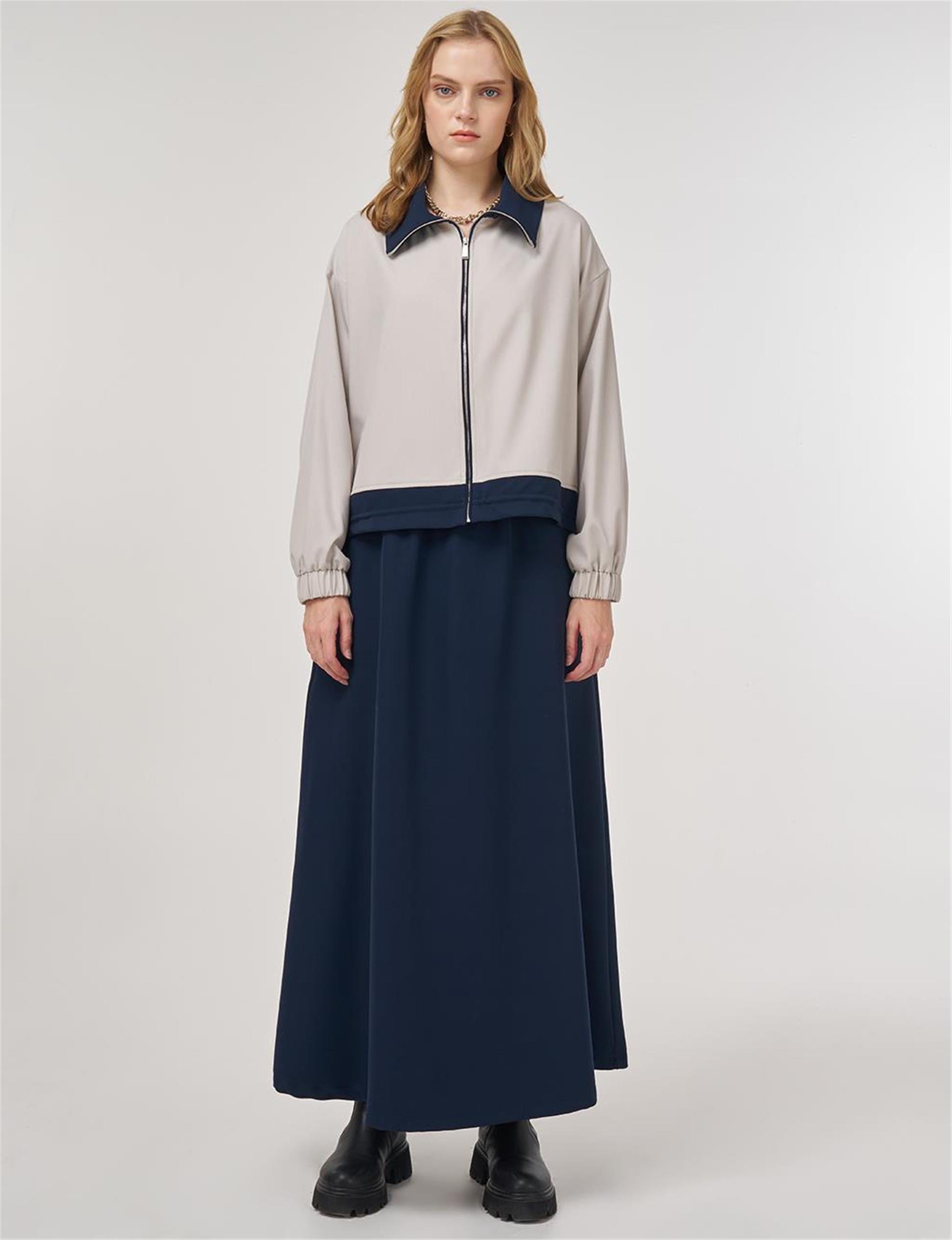 Geniş yaka, düşük omuz, fermuar kapamalı, bilekleri lastik büzgülü ceket. Lastikli bel, bağcıklı, cepli etek. Ceket ve etekten oluşan ikili takımdır.