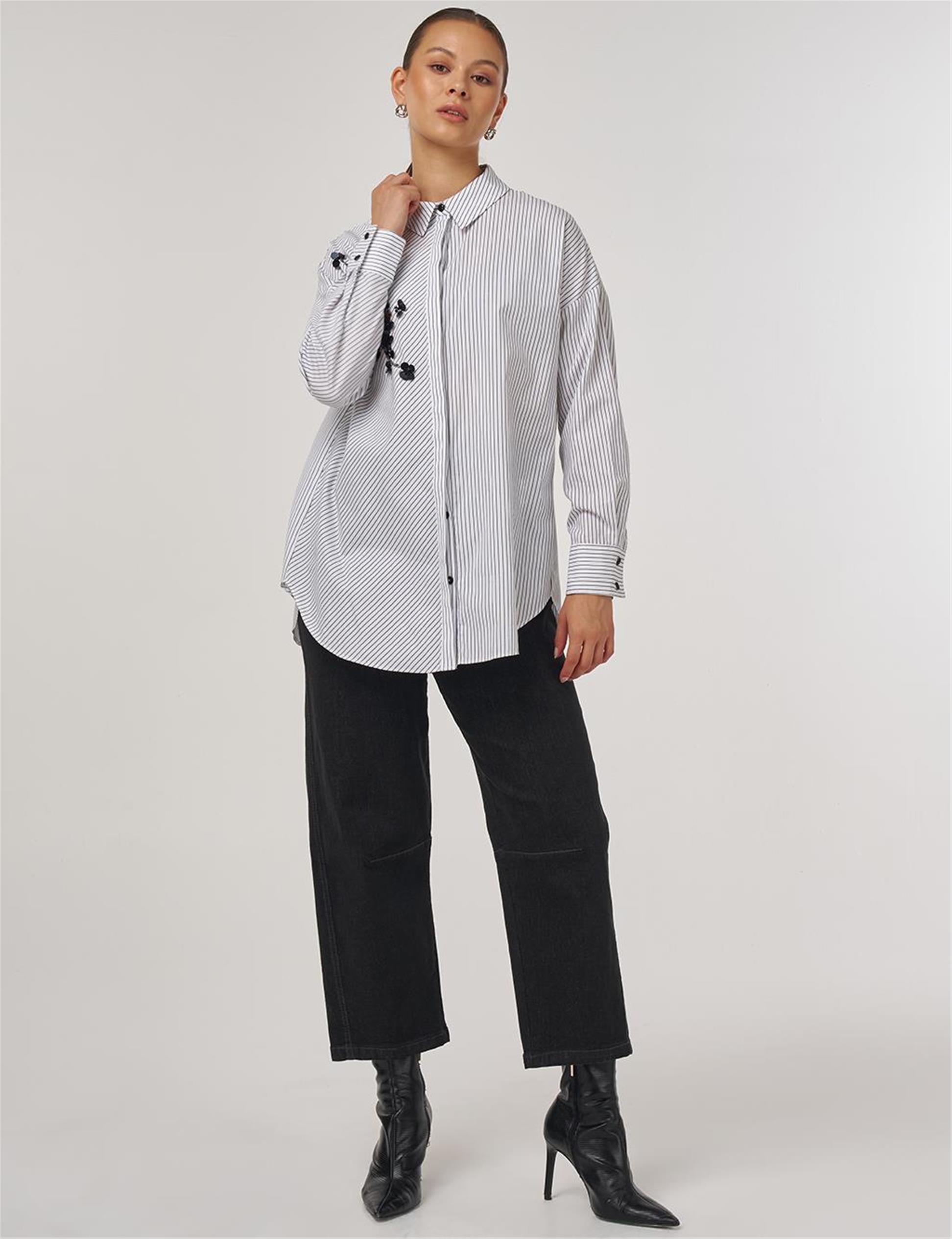 Kayra Çiçek İşlemeli Çizgi Desen Tunik, yüksek pamuk içeriği sayesinde, nefes alan terletmeyen hafif kumaştan üretilmiştir. İşleme detayı ile hareketli bir görünüm sunan tasarım, patı gizli düğme detayıyla ise minimalist bir şıklık sunar. Mevsim geçişleri için tercih edebilir, pantolon, denim, küpe ve ya aksesuarlarla ideal bir görünüm oluşturabilirsiniz.