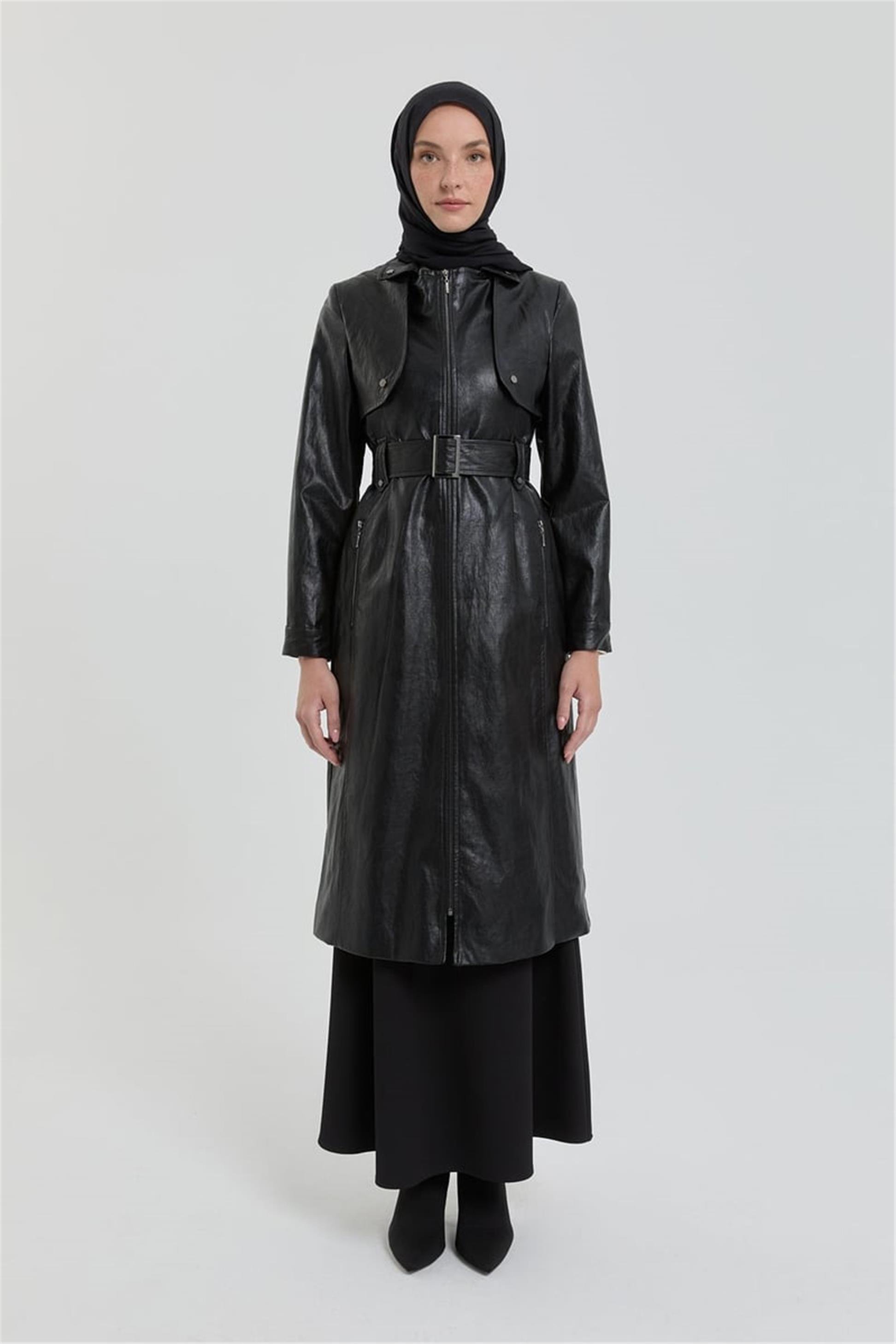 Kemer Detaylı Fermuarlı Deri Kap Siyah