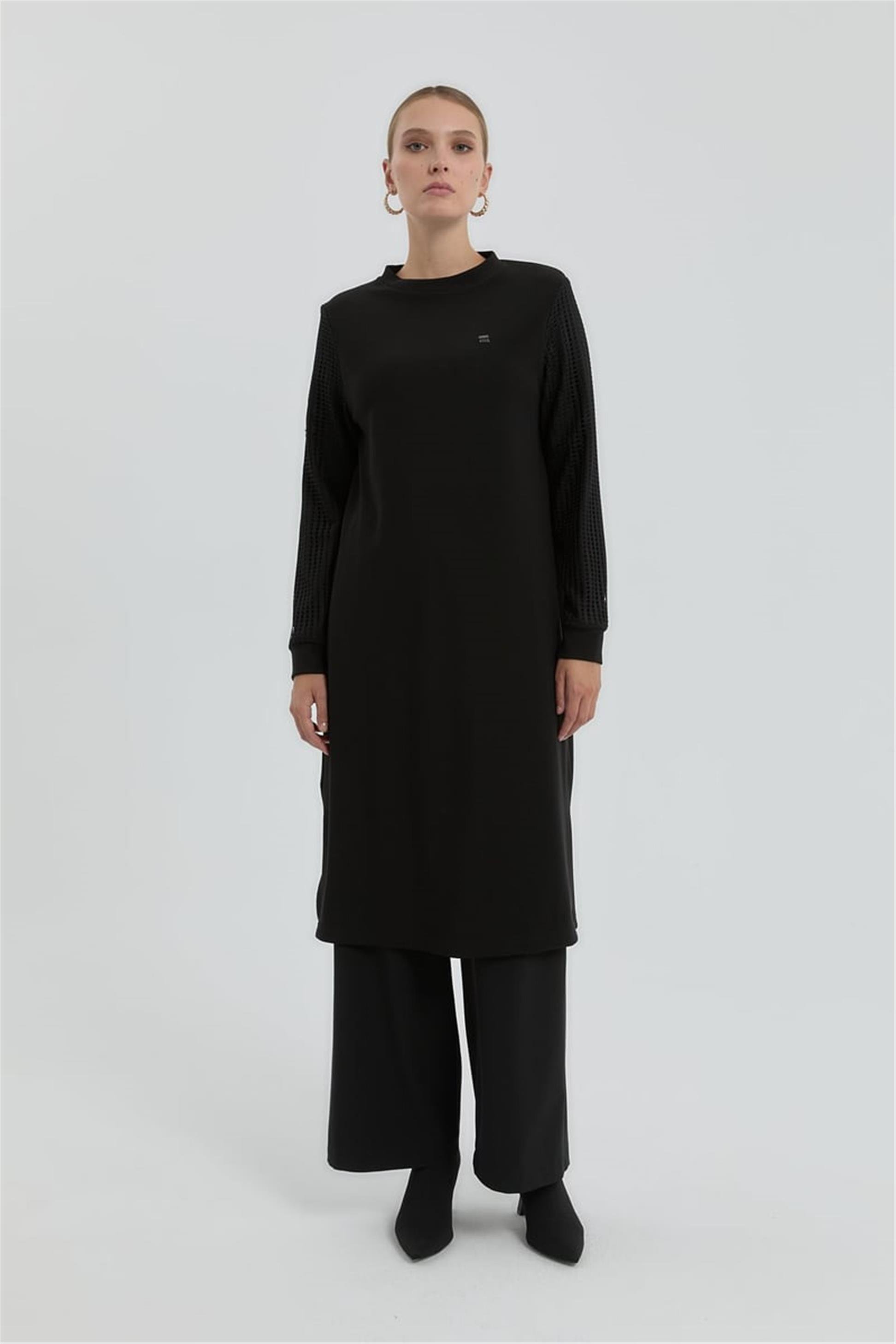 Kolları File Detaylı Örme Uzun Tunik Siyah