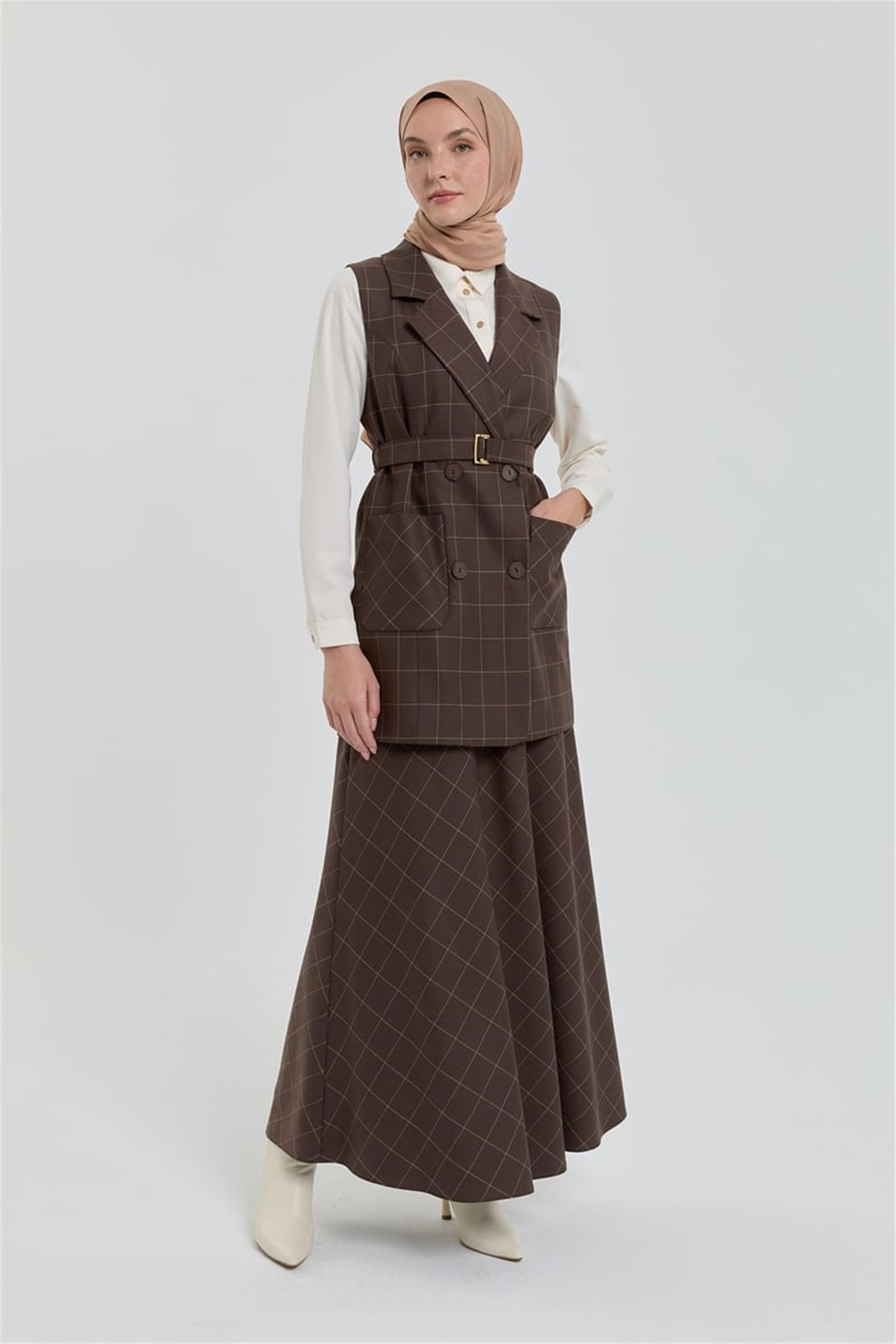 Kuşaklı Ekose Kruvaze Yelek Kahve
