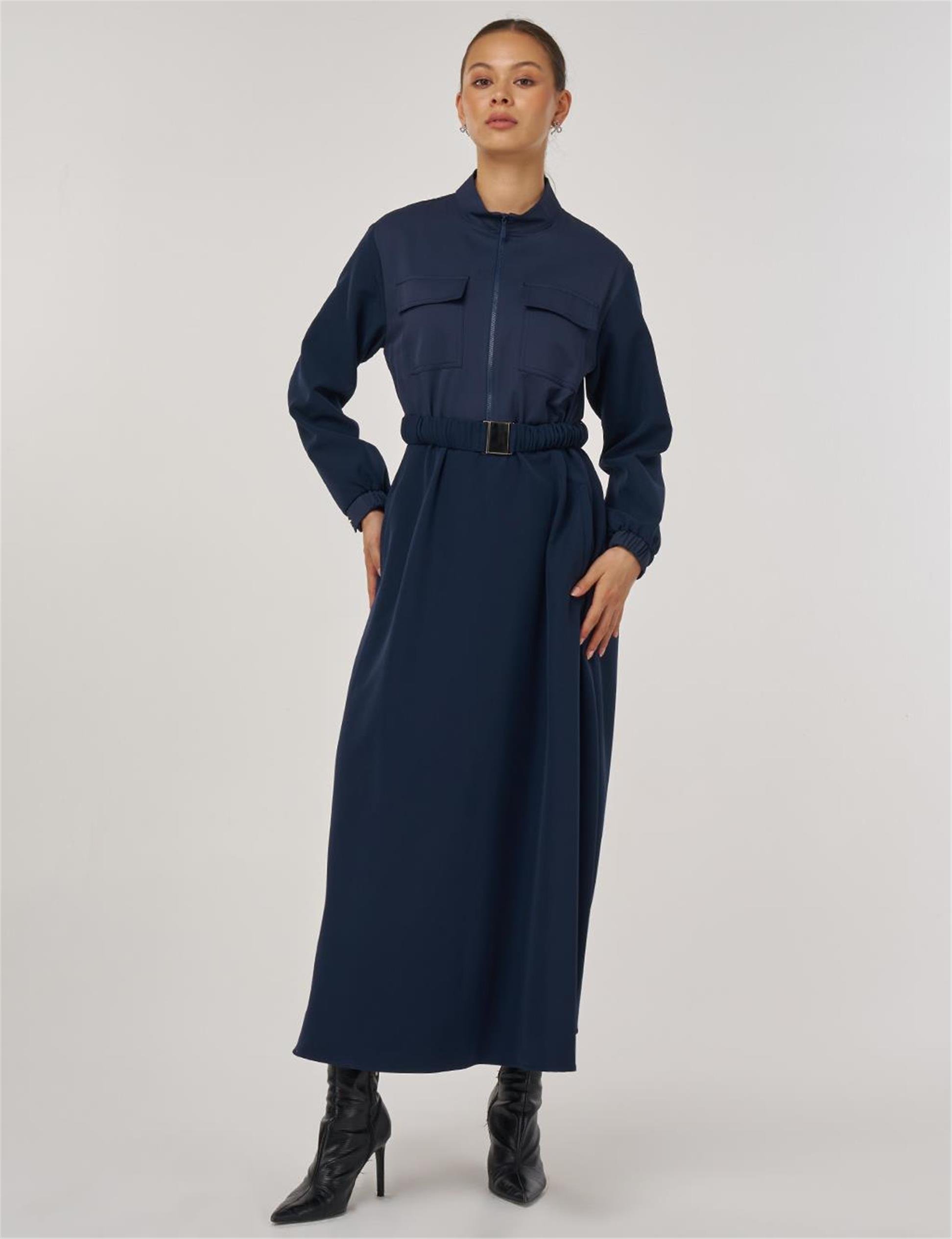 Lastik Kemerli Kapak Cepli Maksi Elbise Koyu Lacivert