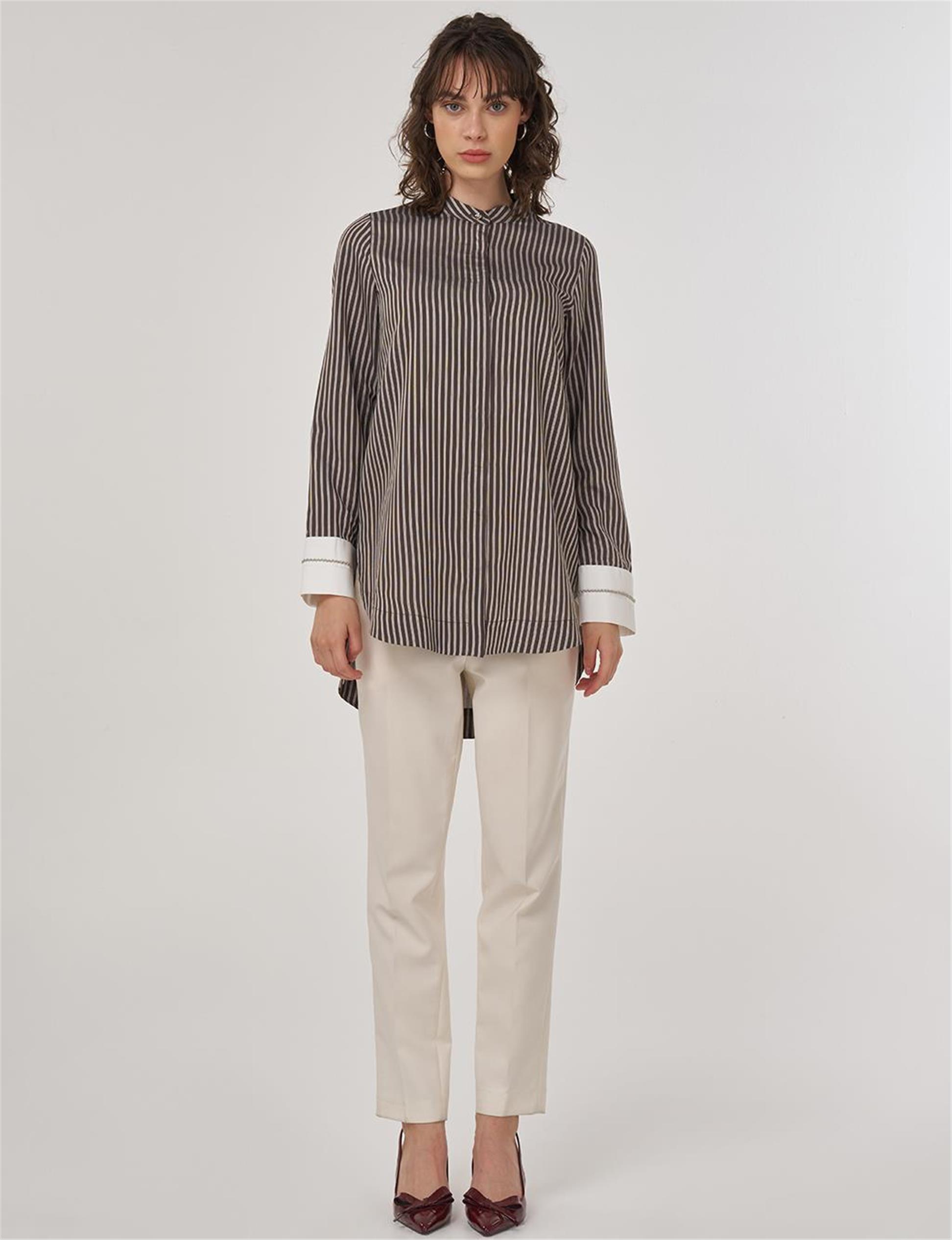 Manşet Detaylı Boncuklu Hakim Yaka Patı Gizli Tunik Kahve