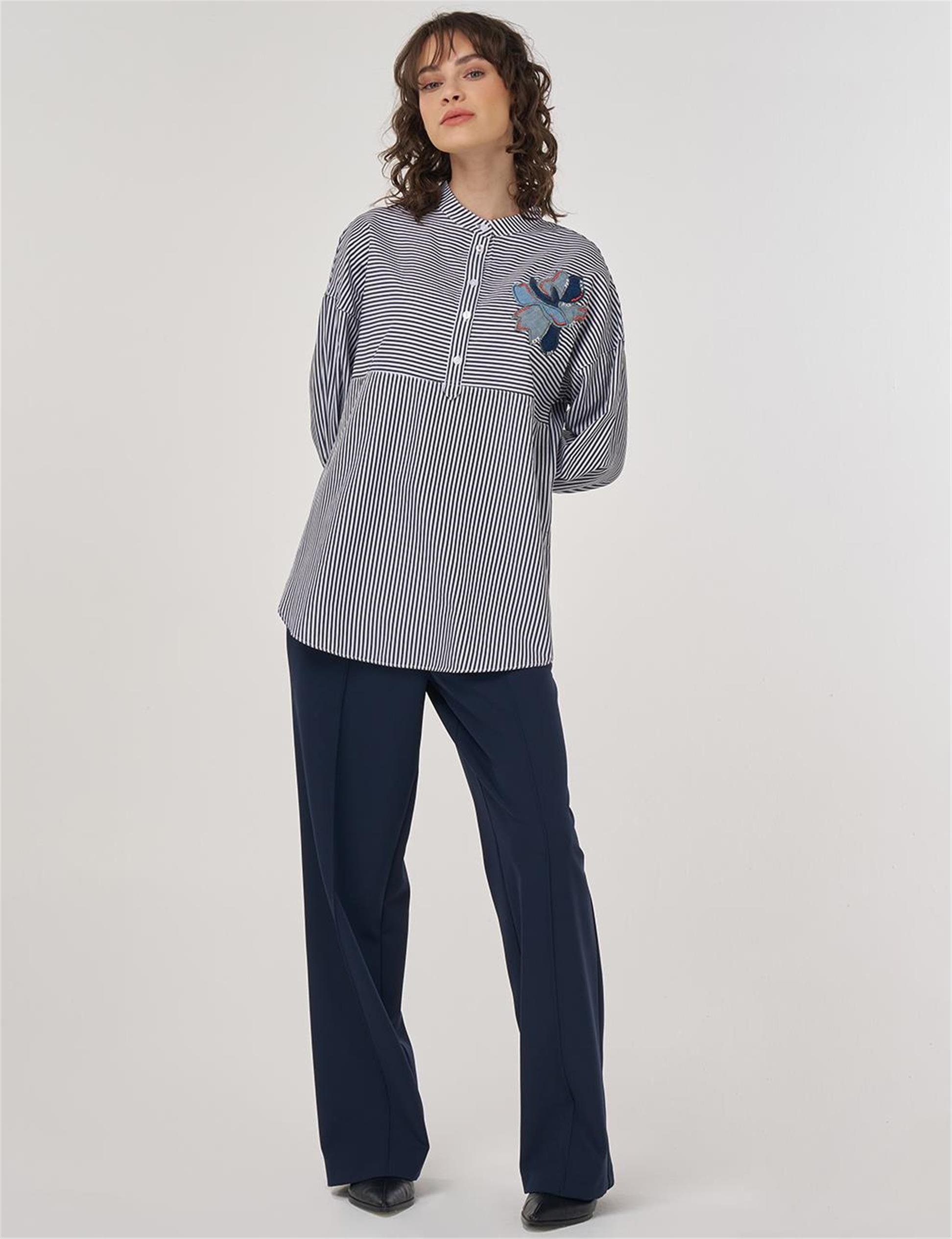Nakış Aplikeli Boncuk Detaylı Hakim Yaka Tunik Lacivert