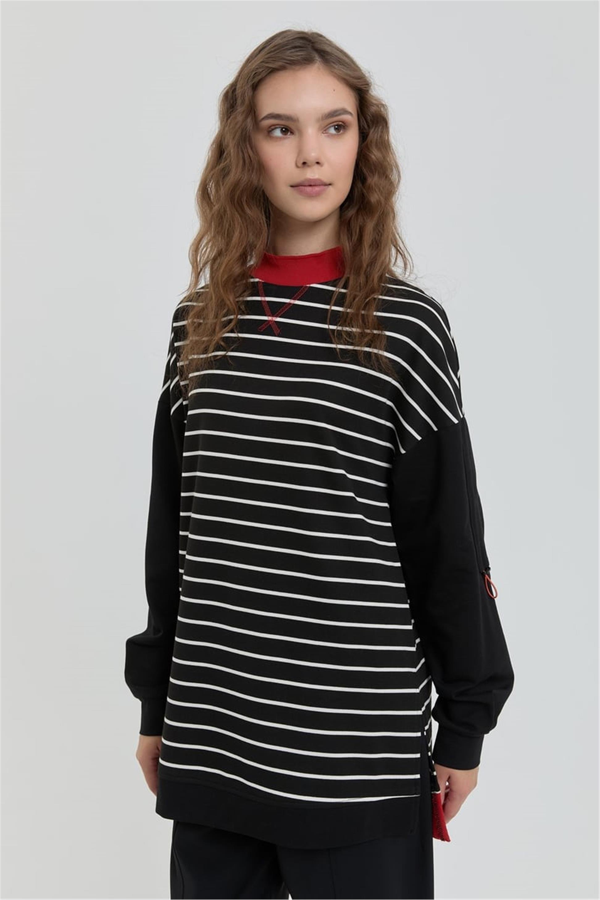 Ribana Detaylı Çizgili Örme Sweat Siyah