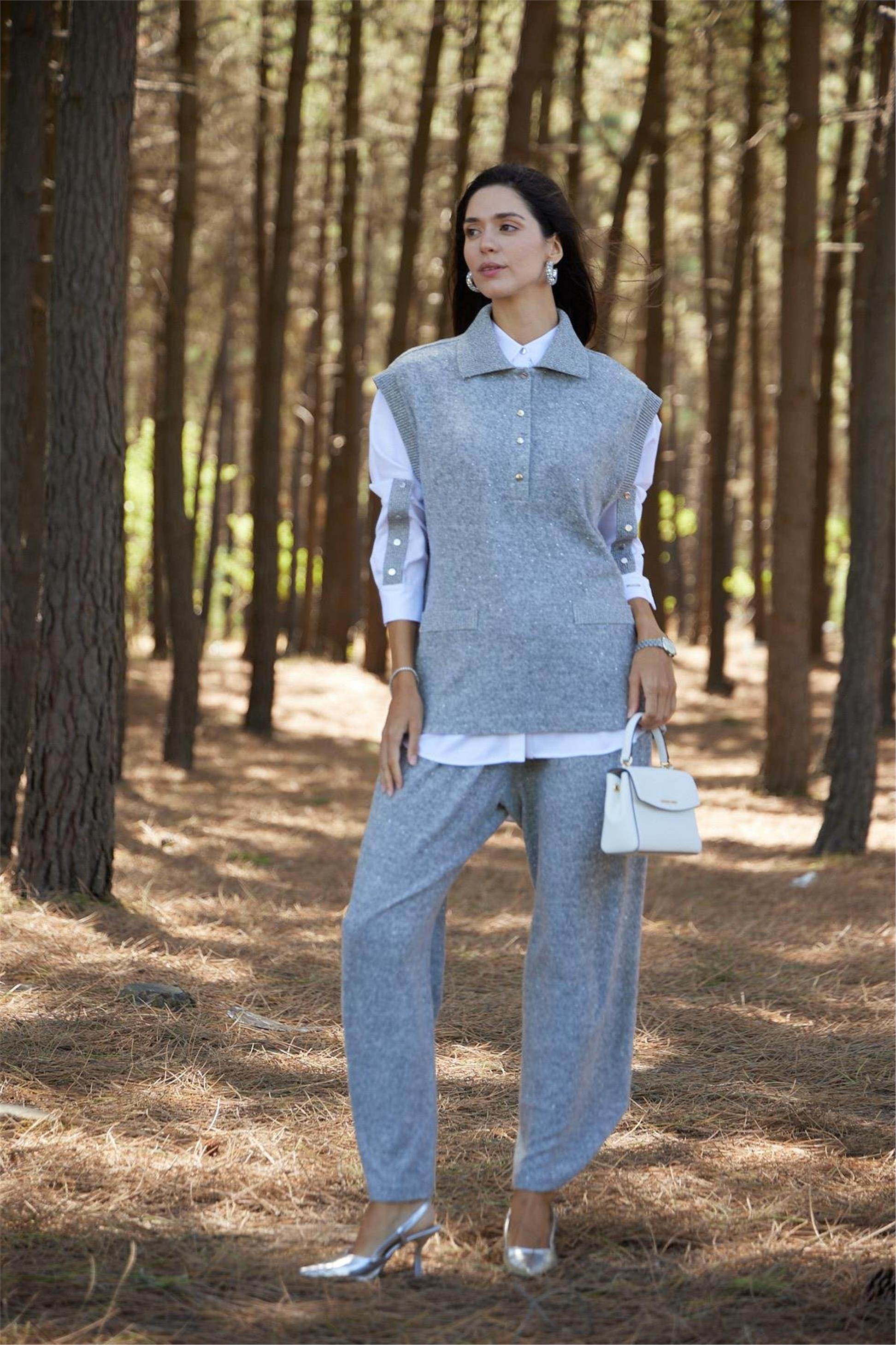 Serpme Taşlı Süveterli Üçlü Takım Gri - 25KMB24691
