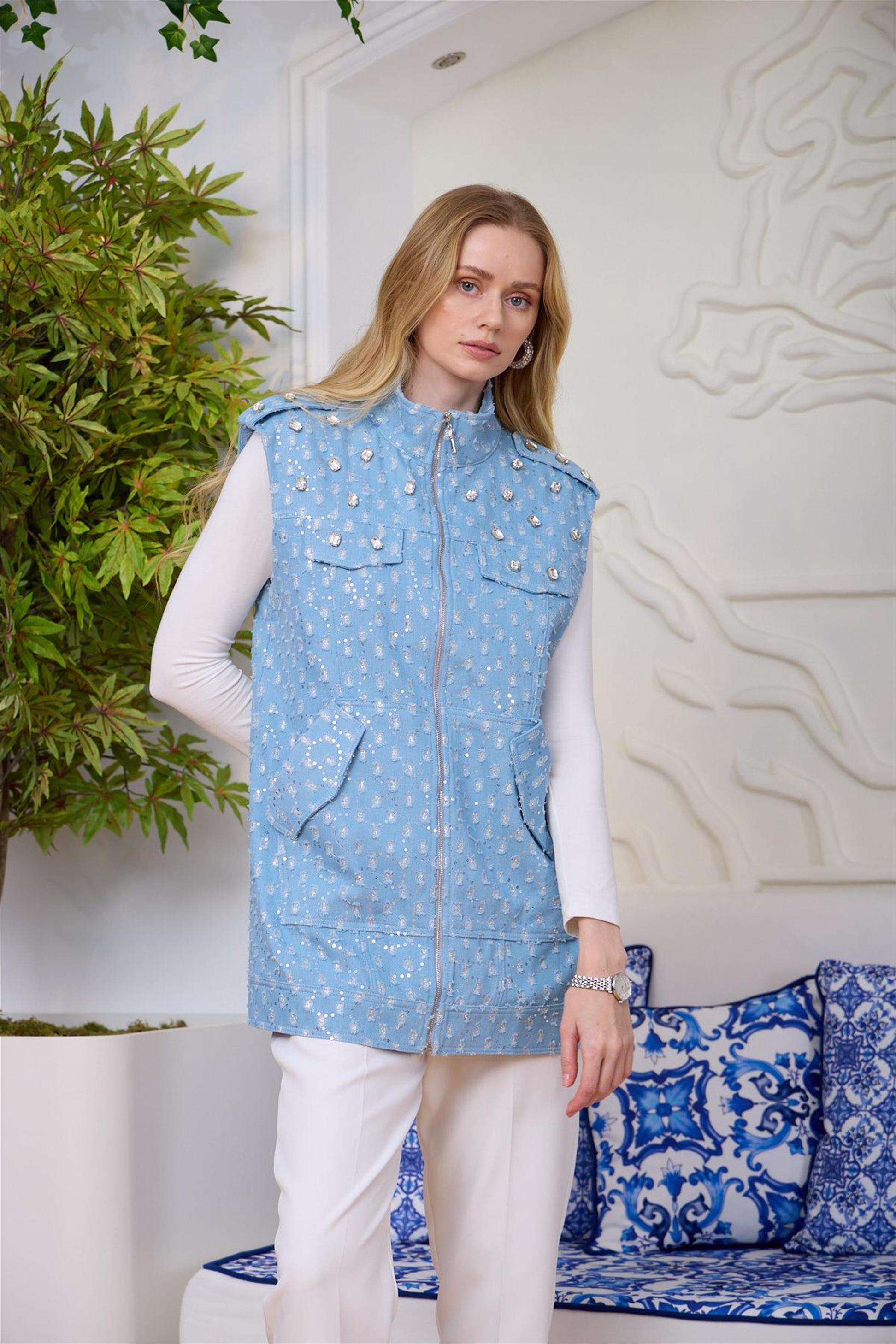 Taşlı Işıltılı Kot Yelek Bebe Mavi - 25KMA2801