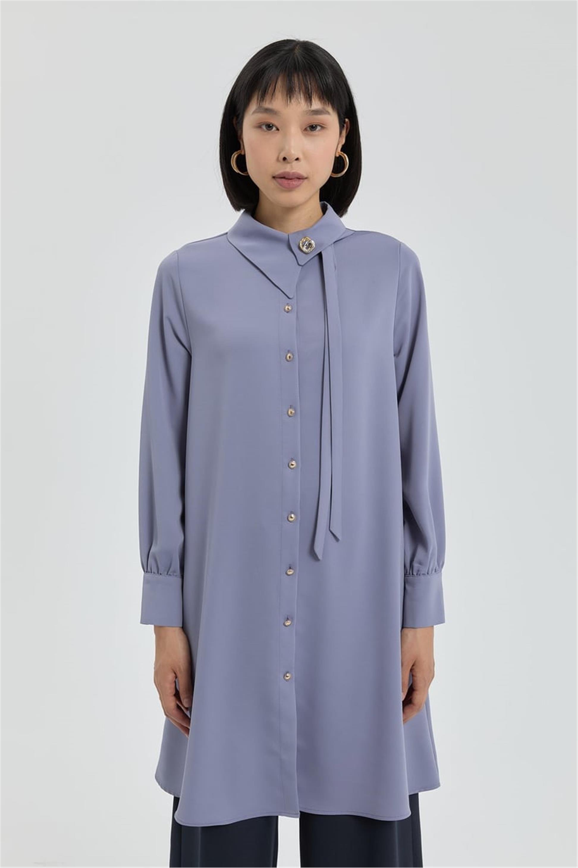 Yaka Detaylı Manşeti Büzgülü Tunik Gri Mavi