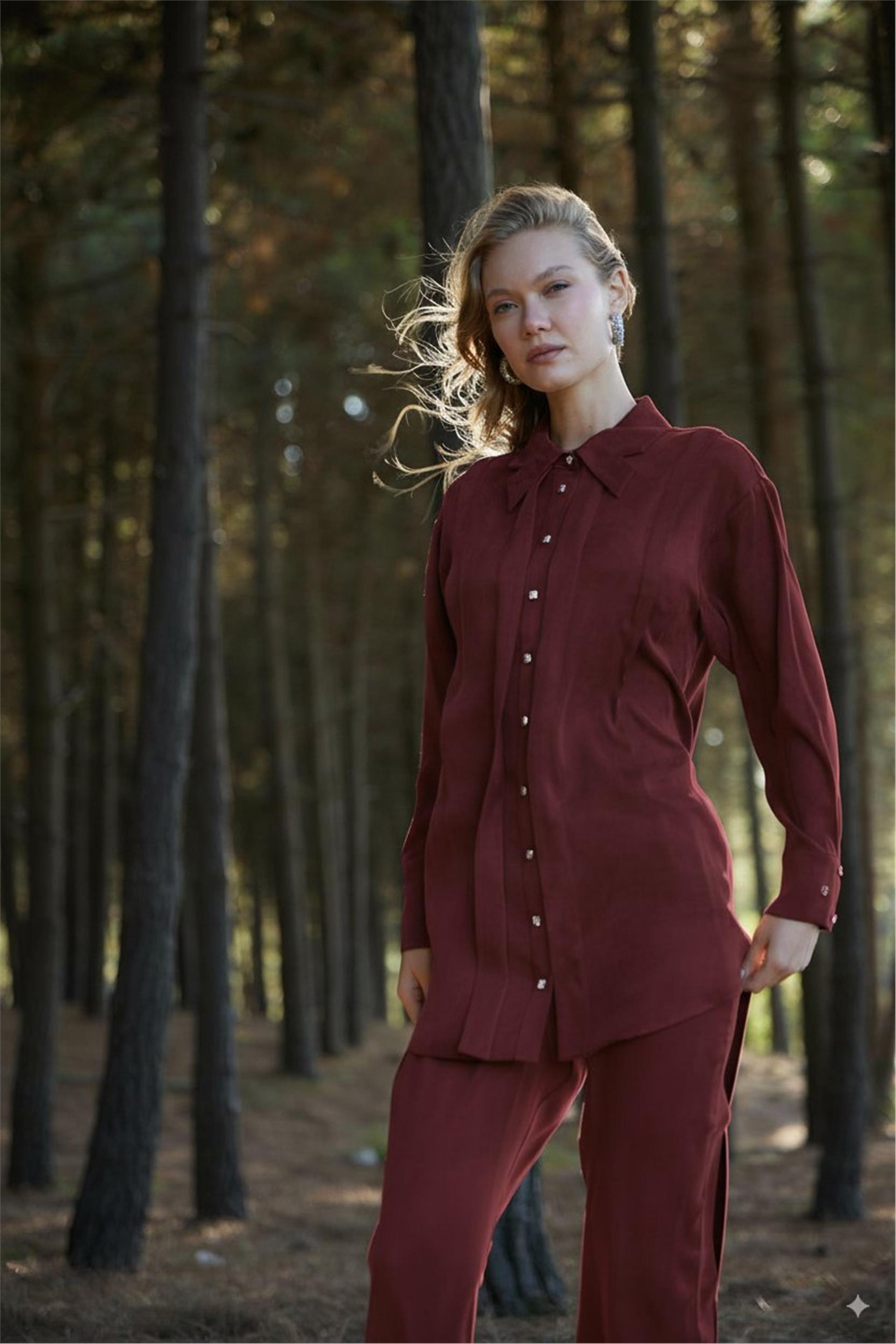 Yaka Detaylı Taşlanmış İpek Mood Basıc Takım Vişne